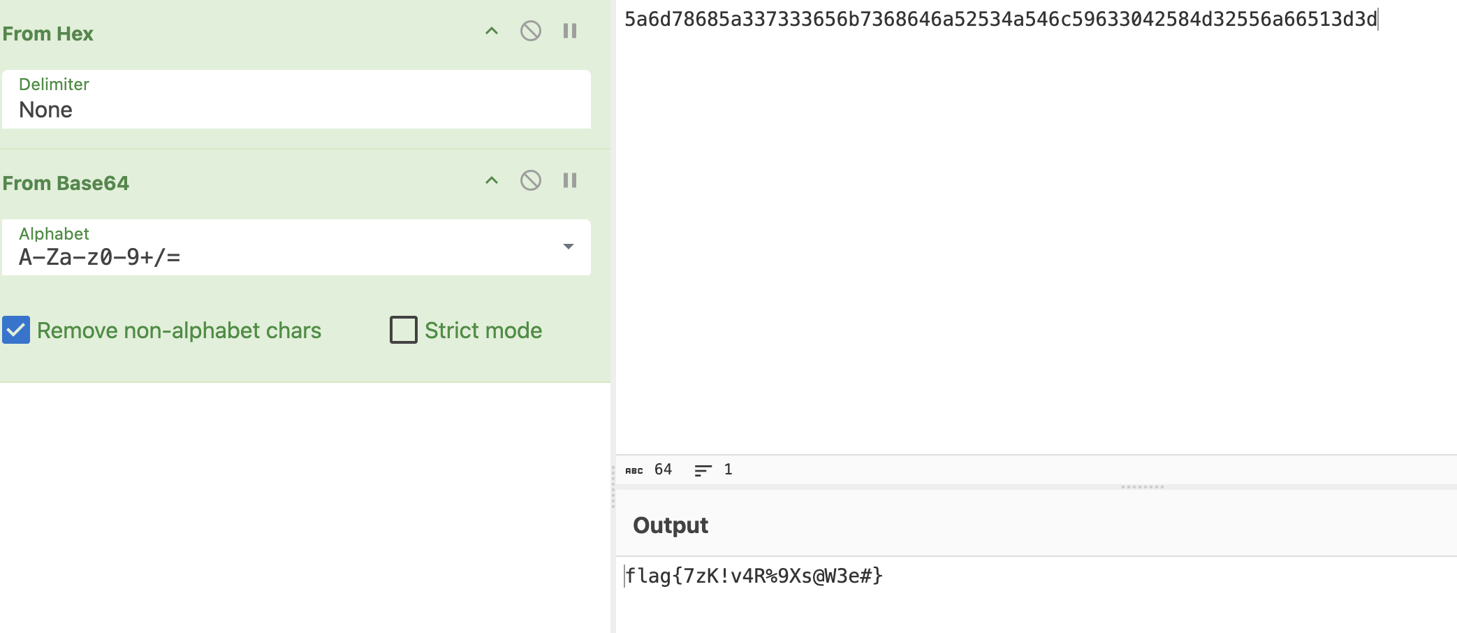 之后在进行hex base64解密即可得到flag